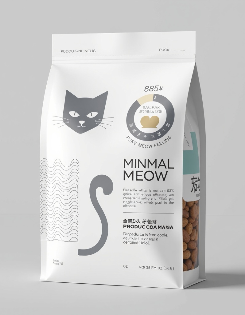 - 右侧透明视窗设计为抽象鱼形(透出猫粮颗粒)