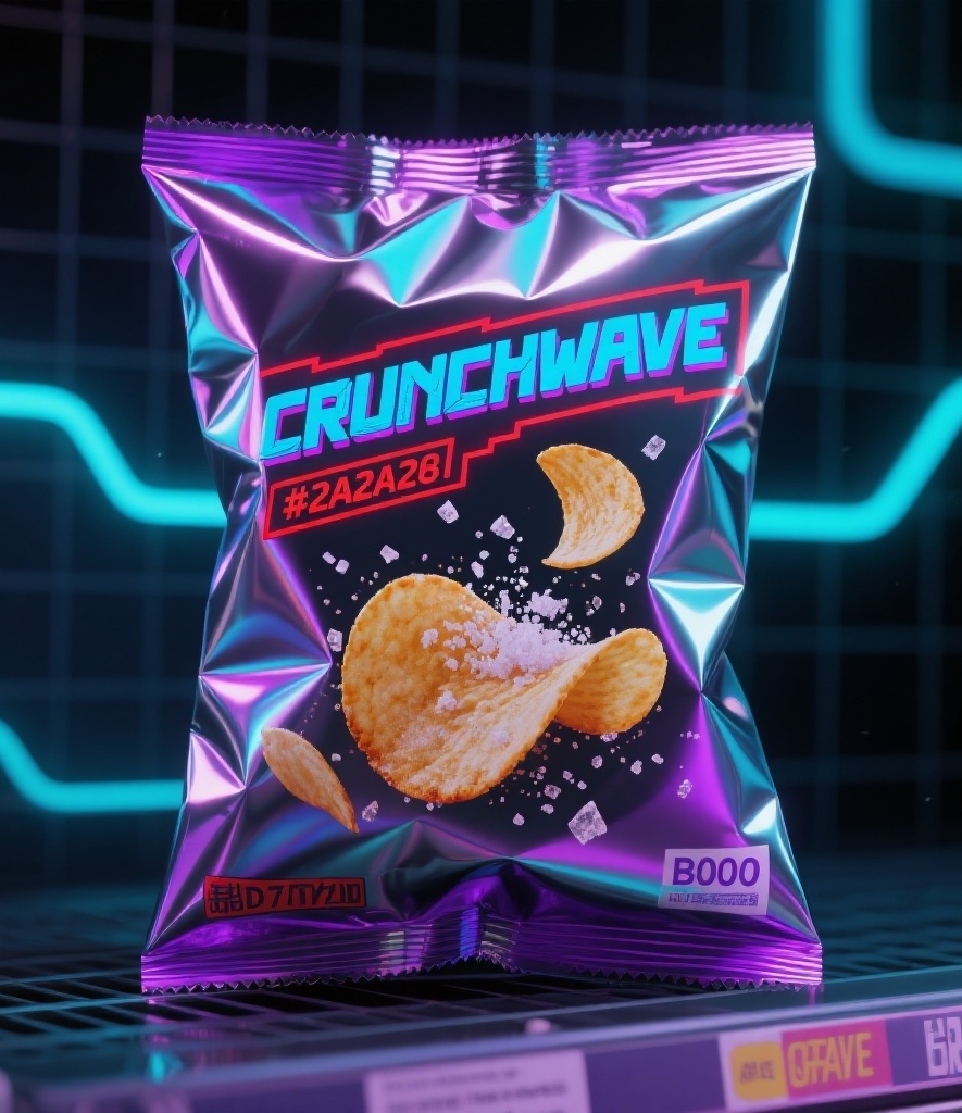 [未来主义薯片海报] 悬浮的金属质感铝箔袋,表面流动着霓虹渐变光纹(荧光绿→炫彩紫),飞溅的薯片碎片携带全息微光,背景由故障艺术网格与数据流构成,左侧强对比镭射标题,右下角像素化爆炸标签,暗调赛博朋克风格,景深虚化,超现实商业摄影 --ar 3:4 --v 6.0