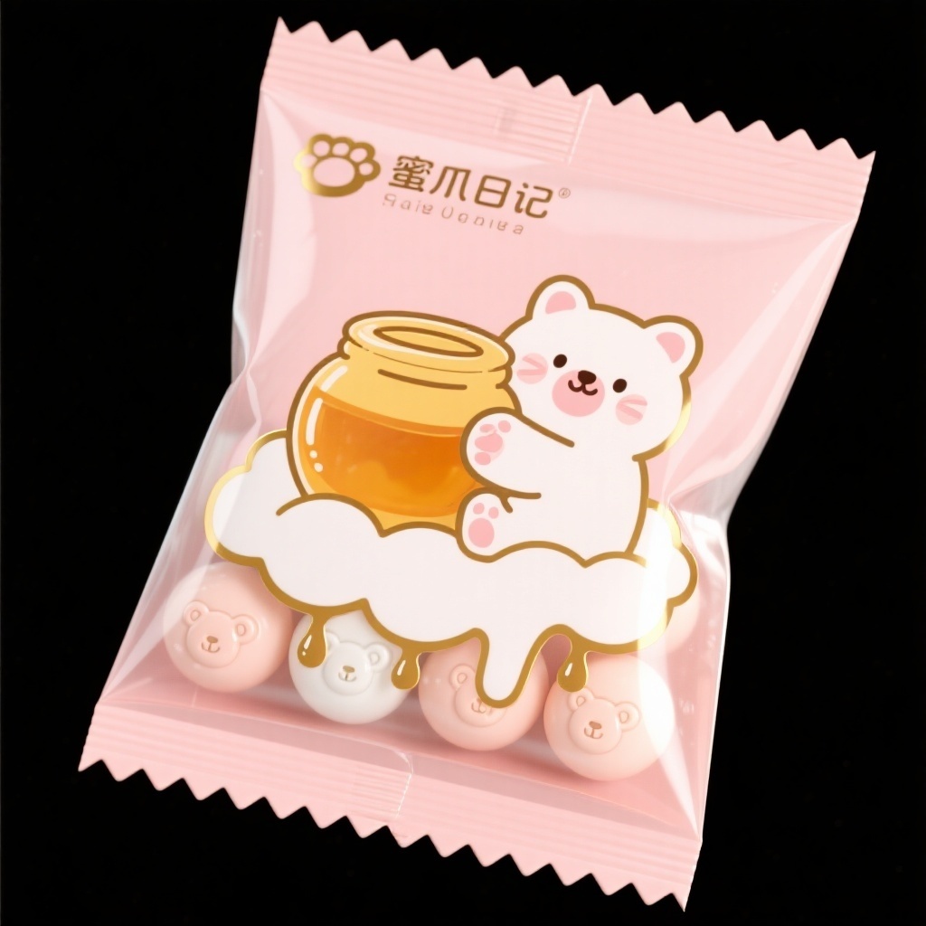 - **产品**:蜂蜜牛奶球糖果 - **品牌名**:蜜爪日记 - **包装样式**:透明锯齿袋 - **设计风格**:软萌3D手绘涂鸦风 - **设计元素**: Q版猫咪环抱琥珀蜜罐手势 半透明熊爪棉花糖云朵托底 锯齿烫金蜂蜜滴落轨迹线 糖果表面浮雕小熊眨眼印花 - **主题配色**:浅桃粉/琥珀金/奶白色