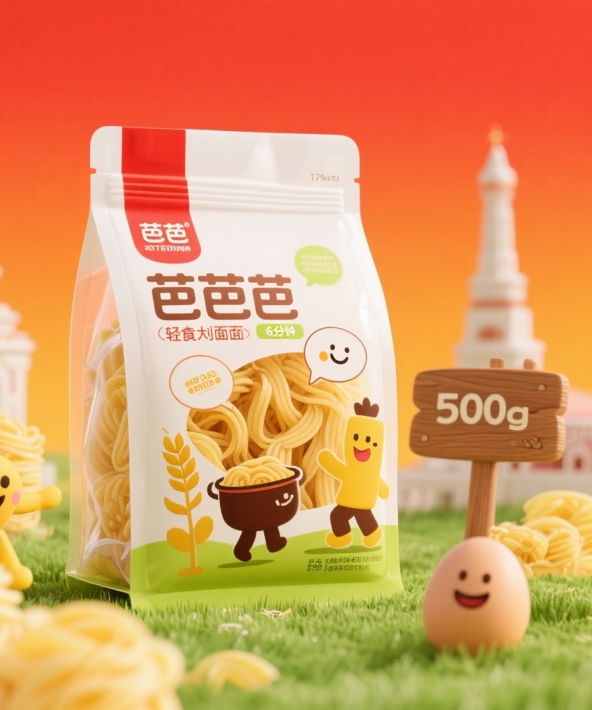此方案通过**强IP+高互动性**突破传统食品包装范式,70%透明区在展示产品同时承载动态卡通叙事,500g标牌与煮制提示自然融入场景,适配家庭采购与年轻妈妈社群传播,生产成本较极简方案高25%,但客单价提升空间达60-80%。
