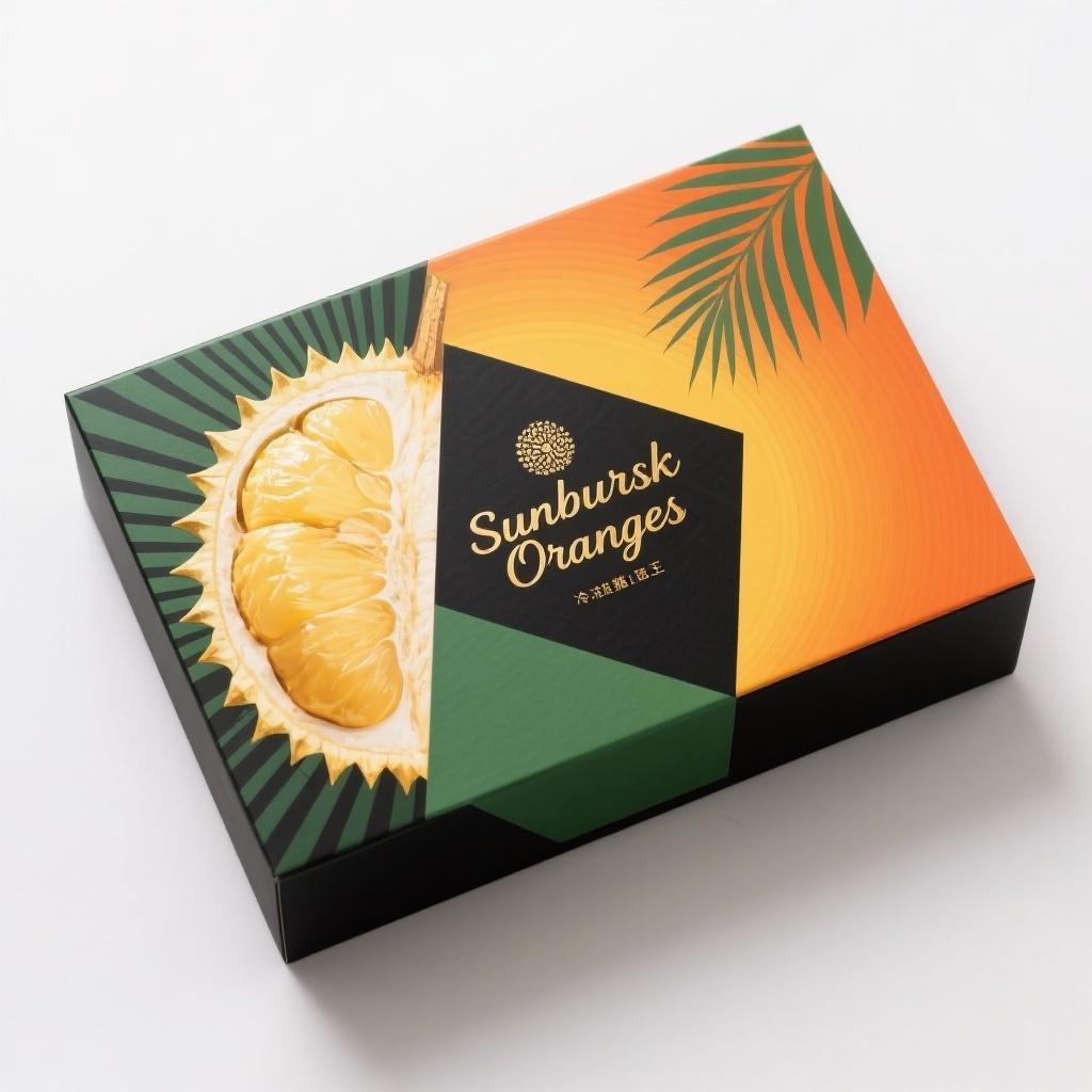 - **产品**:冷凍貓山王榴槤 - **品牌名**:Sunburst Oranges - **包装样式**:长方形盒 - **设计风格**:几何拼接风格 - **设计元素**:几何切割的榴槤果肉纹理、极简放射状尖刺轮廓、热带棕榈叶抽象线条、渐变橙黄光晕波纹、手写烫金品牌名 - **主题配色**:琥珀橙(#FF8C42)+棕榈绿(#5B8E7D)+哑光黑(#333333)