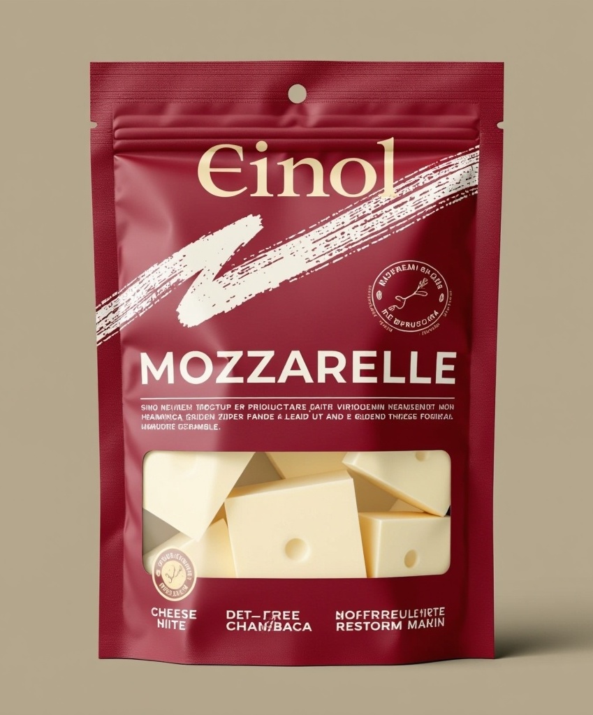 - **产品**:马苏里拉芝士碎 - **品牌名**:意醇 - **包装样式**:自立拉链封口袋 - **设计风格**:简约现代+意大利风情 - **设计元素**: 1. 中心视觉为流动的芝士拉丝抽象线条 2. 底部融入奶酪块切割纹理图案 3. 右上角烫金橄榄枝环抱品牌徽章 4. 字体采用无衬线斜体字增强动感 5. 侧边透明视窗展示产品颗粒质感 - **主题配色**:勃艮第红(#9B1B30)主调,搭配乳酪白(#FFF5E1)与香槟金(#D4AF37)