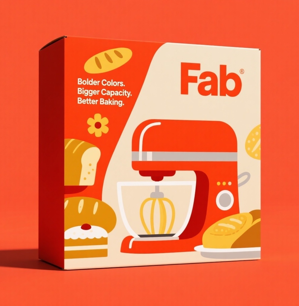 为“Fab”品牌的搅面机精心设计一款彩盒包装,采用矢量扁平风格,画面简洁现代且富有活力。设计元素包括:主视觉为烘焙类食材(如面包、蛋糕等),突出产品功能;背景为橙红色调,营造温暖氛围;细节融入金黄色点缀(色号#FFD700),象征烘焙出的美味;品牌标识以简约字体嵌入浅米色(色号#F5F5DC)区域,优雅呼应整体设计。主题配色以主色橙红色为核心,营造热情饱满的品牌印象;点缀色金黄(#FFD700)增添食欲感;辅助色浅米色(#F5F5DC)平衡整体色调,呈现温馨舒适的视觉效果,完美契合标语“Bolder Colors. Bigger Capacity. Better Baking.”的意境。