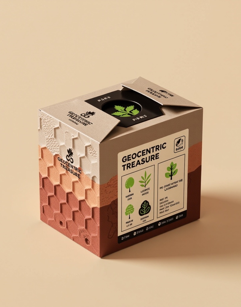 **核心创意说明**:将包装设计成“红薯生长切片”概念,蜂窝结构象征土壤孔隙,热感标签强化科技农耕联想,开盒后包装可重组为微型种植装置,呼应品牌“从土地到再生”的循环理念。