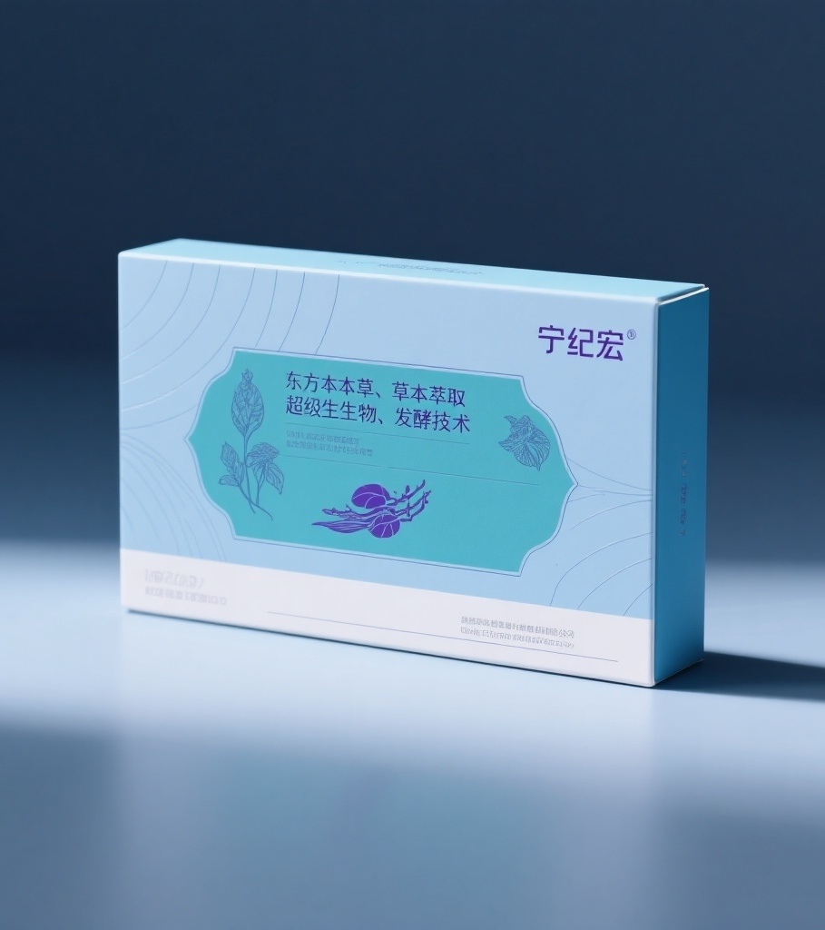 为“宁纪宏”品牌的中药设计一款普通药盒,采用极致简约的设计风格,画面简洁干净。设计元素包含:主视觉是清晰的中药,将缩小后的‘东方本草,草本萃取,超微生物,发酵技术’字样置于主视觉图案里;背景用极简单的线条营造冷色调氛围;细节仅融入极少的中药图案增添专业性;品牌标识以简约字体放在药盒显眼处,药盒最下方预留写公司信息的区域。主题配色以主色蓝色或蓝绿(选合适色号)营造专业冷静感,点缀色紫色(选合适色号)增添神秘层次,辅助色白色(#FFFFFF)平衡色彩与勾勒细节。