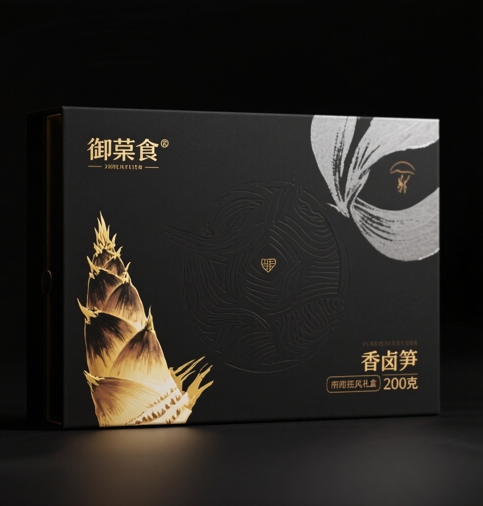 2. **金色元素**:品牌名“御篁食品”与产品名“香卤冬笋”以金色书法字体呈现,搭配金线勾勒的竹叶纹样;