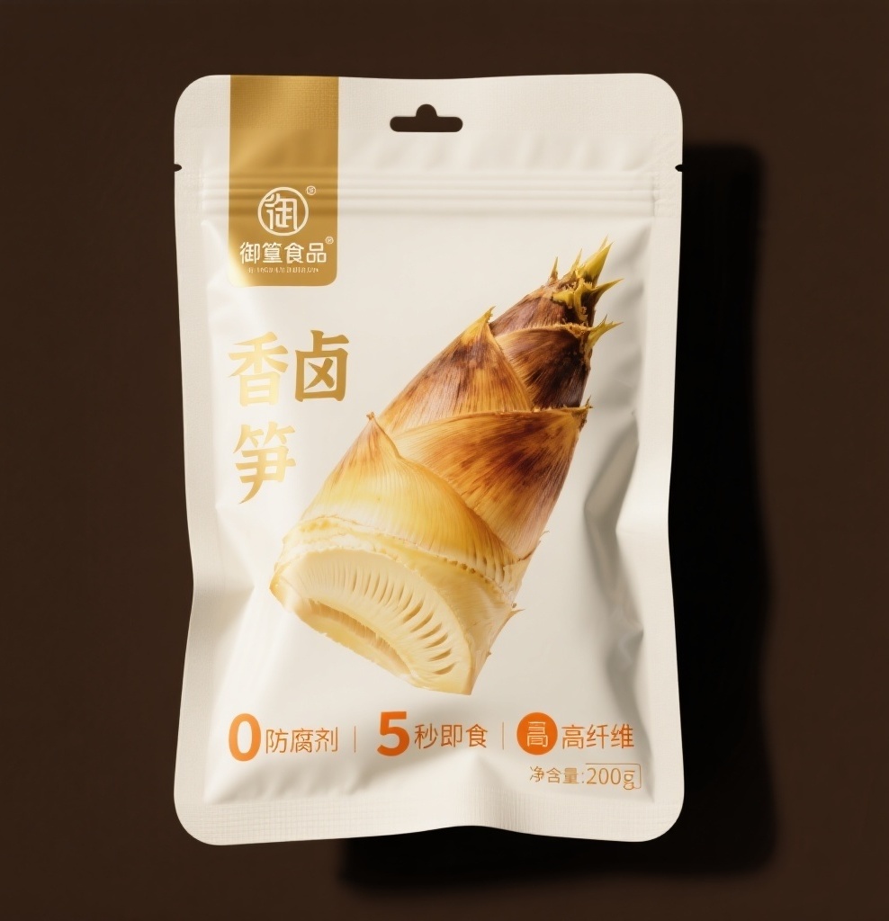 为“御篁食品”品牌的香卤冬笋精心设计一款四边封袋包装,采用简约高雅的风格,画面简洁且富有质感。设计元素包括:主视觉为半颗冬笋形态,突出产品形象;背景以米白色打底,营造干净氛围;细节处点缀产品的三大卖点“0防腐剂、5秒即食、高纤维”以及产品净重200克等信息,用金箔橙突出显示;品牌标识以简洁字体置于包装显眼位置,与整体风格相呼应。主题配色以主色琥珀棕(未提及准确色号)为核心,展现沉稳质感;竹青(未提及准确色号)作为另一主色增添清新感;辅助色米白(未提及准确色号)营造柔和氛围;金箔橙(未提及准确色号)作为点缀色,突出关键信息,整体包装工艺精致,契合产品定位和目标人群喜好。