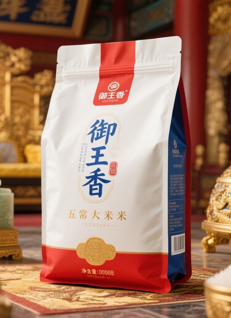 为“御王香”品牌的五常大米设计一款大米包装袋假六面的高端包装。采用极简克制、讲究留白与平衡的现代设计风格,彰显文艺气息与优雅清逸,呈现东方审美意境之美,同时展现极为精细华贵的皇宫宫廷场景。设计元素方面,主视觉是经过专属商标字体设计的“御王香”,字体笔画独特造型,线条细致且形态别致,融入隶书韵味;背景为极为精细华贵、带有皇帝所用物件如玉玺、龙袍、金銮宝座等元素的皇宫宫廷场景画面;细节处蕴含独具匠心的设计感,同时补充版面广告语、净含量、logo等信息。主题配色以主色红色(如#FF0000)、蓝色(如#00008B)和辅助色金色(如#FFD700)为主。包装排版简约大气,留白干净,达到大师级设计水准,避免低俗感,契合高端消费群体审美。