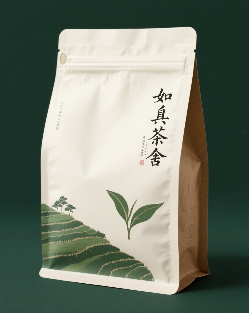 - **产品**:茶叶 - **品牌名**:如是茶舍 - **包装样式**:纸质包装袋 - **设计风格**:简约中式风 - **设计元素**:瘦金体毛笔字品牌名、茶园山水插画、茶叶轮廓图 - **主题配色**:米白色、深绿色、浅棕色