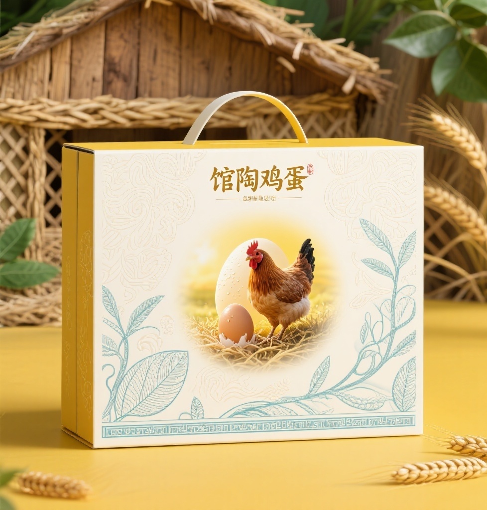 为“馆陶鸡蛋”品牌的鲜鸡蛋设计一款手提箱包装,采用以自然生态为主题的花纹纹理风格,整体设计强调材质肌理与装饰美感,兼具工艺感与文化品位。设计元素包括:主视觉为一只母鸡刚产下一颗鲜鸡蛋的温馨场景,画面中央突出鸡蛋,蛋壳表面带有细微水珠和柔和光泽,仿佛清晨初生,保留自然体温;周围融入淡淡的暖黄色光晕,由内向外轻柔扩散,象征新鲜与生命力;背景采用精细的花纹纹理设计,融合多种自然元素:顶部为木纹肌理,象征鸡舍结构;中部为稻草编织纹样,细腻交错,体现天然养殖环境;底部融入叶脉纹与麦穗浮雕线条,以浅浮雕形式呈现,增强层次感与生态寓意;品牌标识“馆陶鸡蛋”采用优雅有力的书法字体,颜色与整体色调协调,嵌入纹理之中或置于素色留白区域,搭配藤蔓状手绘边框或传统纹样装饰,整体布局居中,视觉平衡,突出产品又不失品质格调。主题配色以主色明黄色(#FFD700)为核心,象征阳光与活力,呼应鸡蛋的天然本色;点缀色草绿色(#32CD32)用于叶脉、麦穗等纹理细节,强化生态养殖印象;辅助色浅蓝色(#87CEFA)作为背景渐变或留白区域底色,营造清晨空气般的清新通透感。包装材质选用环保硬纸板,表面压印纹理工艺,局部UV突出水珠与光晕细节;手提部分为加厚织物提手,提升整体质感与使用体验。整体设计将自然意象转化为精致纹理,艺术性与实用性兼具,适用于精品生鲜、节令礼品或文化礼盒场景,传递‘新鲜、天然、有温度’的品牌价值。