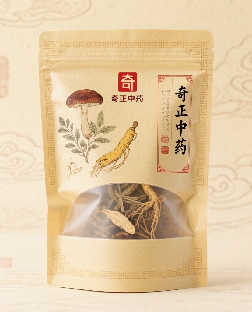 为“奇正中药”品牌设计一款高端中药饮片通用包装,采用四边封塑料袋样式(宽200mm,高260mm),带有居中透明开窗,可清晰展示内部饮片。整体设计风格为中式古典,融合传统美学与现代包装功能。设计元素包括:主视觉为工笔风格绘制的代表性中药材(如灵芝、黄芪、当归),线条细腻,形态典雅;背景采用仿宣纸肌理,辅以淡雅云纹,营造古朴静谧氛围;细节融入传统回纹边框与朱红印章图案,提升文化质感;品牌标识以红色方块内嵌“奇正中药”字样,置于包装显著位置,保持品牌统一性。主题配色以主色淡黄色(#F8ECC2)为基调,模拟宣纸色泽,传递天然温和意象;点缀色深红色(#9E1F15)用于印章、边框与文字,强化视觉焦点;辅助色墨黑色(#2E2926)用于标题与细线,增强层次与稳重感。整体画面布局平衡,开窗区域圆润有度,兼顾美观与实用,体现中医药文化的深厚底蕴与现代品质感。包装材质呈现哑光质感,提升高级感。