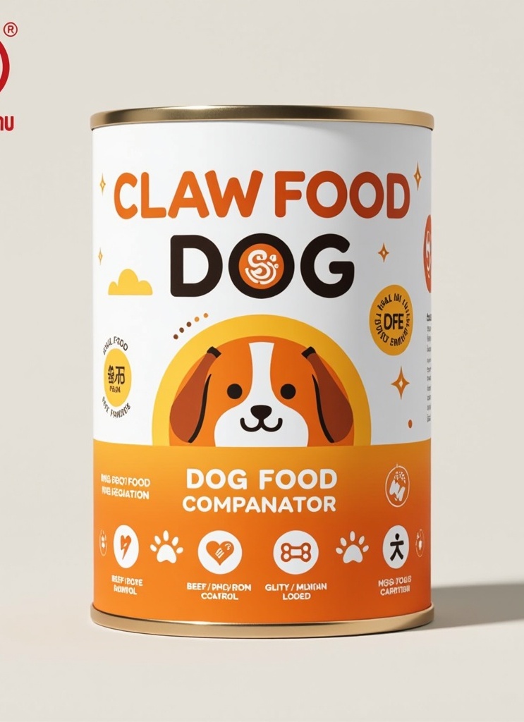 2. **核心区**:爪印纹理粗体卡通字"宠物犬粮伴侣",渐变色爪印能量环(浅橙→深棕),嵌入式牛肉/鱼油/胡萝卜扁平图标