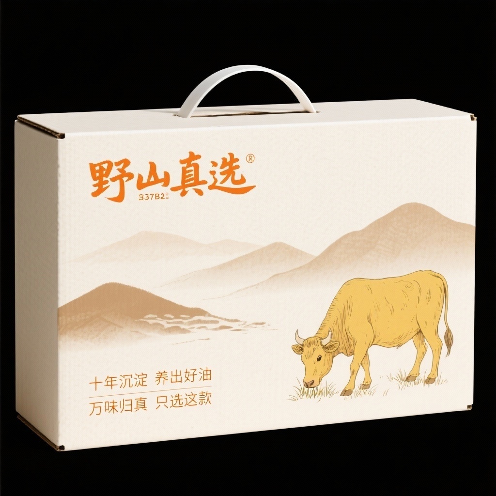 为“野山真选”品牌设计一款农产品礼盒的长方体手提纸箱,搭配白色提手,整体采用现代简约自然风格,融合手绘插画与质朴文字叙事,突出山野原生态与匠心沉淀的品牌理念。设计元素布局如下:主视觉为一头手绘黄牛,线条柔和、细节丰富,姿态安详,低头吃草,占据正面版面的四分之一大小,位置偏右下方,作为核心视觉焦点,比例适中且更具存在感;背景为米白色(#F4F0E8)天然纸感基底,融入细腻的浅纹肌理,营造温和的手工质感与自然触觉联想;远景以浅棕色(#B08C6B)勾勒简洁的层叠山脉轮廓,延伸至牛身后方,形成深远的空间意境,象征纯净产地环境。已完全移除菌类图案,保持画面纯净简洁。文字区域位于左侧偏上,品牌名“野山真选”以暖橙色(#D37B2A)手写体书法字呈现,字号较大,居中左对齐,传达真诚与温度;下方两行文案“十年沉淀 养出好油”与“万味归真 只选这款”采用细长宋体风格,同样为暖橙色,左对齐排版,行距适中,形成清晰的阅读节奏。整体布局留白充分,视觉重心平衡,右侧与上方保留开阔空间,增强高级感与呼吸感。提手为纯白色棉绳,嵌入厚实纸板提孔,结构稳固且视觉纯净。配色以米白色为主色,暖橙色为点缀色用于文字,浅棕色用于牛与山脉,色调温暖和谐。包装建议采用哑光覆膜工艺,略带磨砂质感,提升高级感同时保留纸张本真触感,契合高端农产品礼品定位。