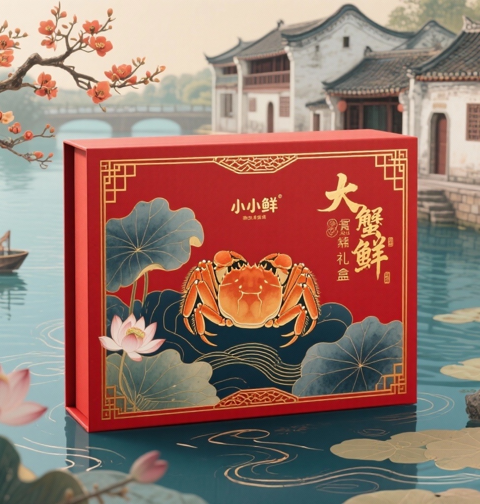 - **设计元素**:主视觉为水墨质感的大闸蟹工笔画,背景融合**岭南水乡元素(镬耳墙建筑、木棉树、珠江水域)**,层叠荷叶与半开荷花,水波纹以金色线条勾勒,盒面边缘饰以**岭南传统窗花纹饰**,品牌名以金色书法字体烫金呈现