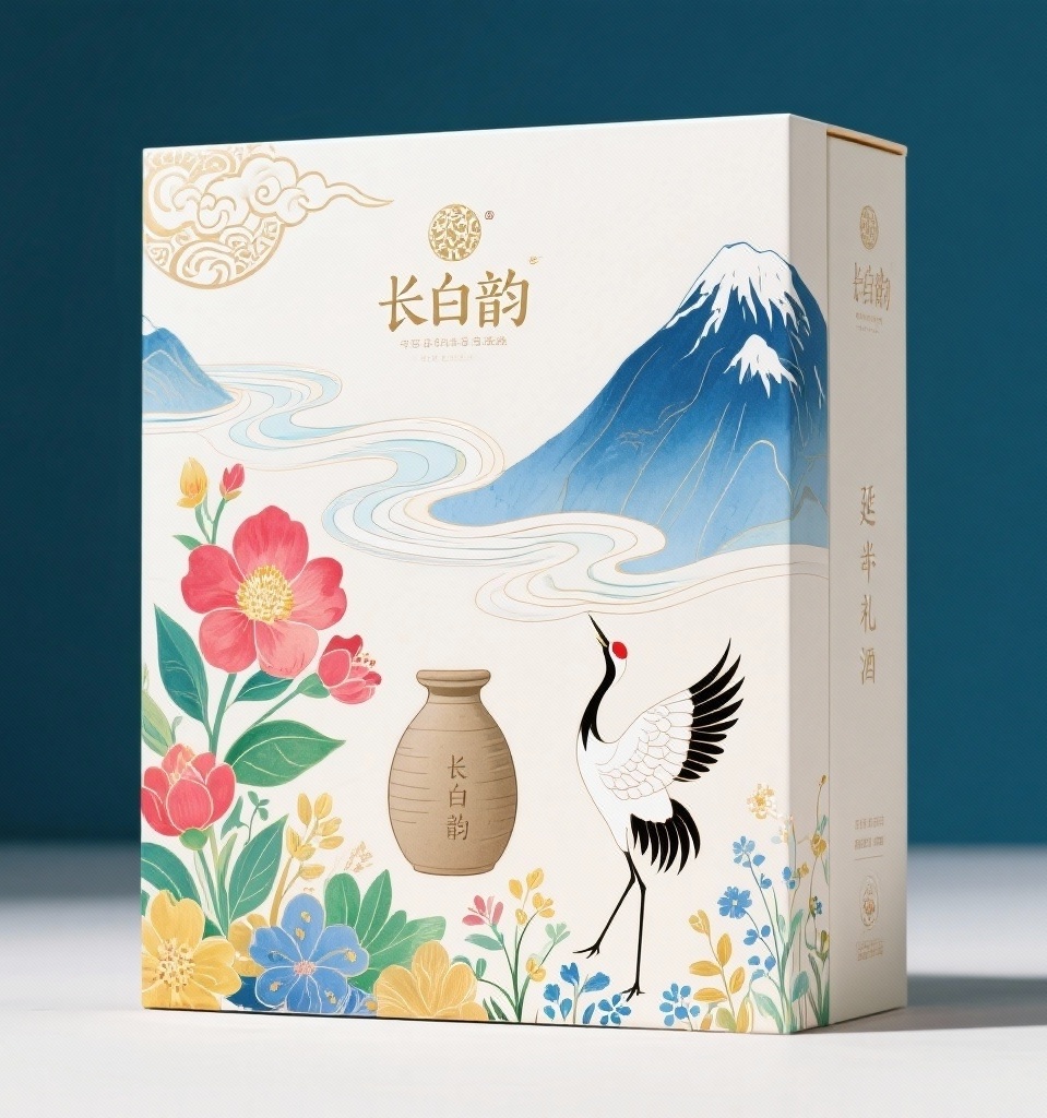 - **产品**:延边特产米酒 - **品牌名**:长白韵 - **包装样式**:竖版礼品盒 - **设计风格**:手绘插画风格 - **设计元素**: - 朝鲜族传统纹样(如云纹、水波纹) - 金达莱花手绘图案(多色花瓣) - 长白山山脉线条 - 陶制米酒罐简笔插画 - 朝鲜族鹤舞抽象轮廓 - 野花丛手绘图案(混合花卉) - **主题配色**: - 主色:米白色(底色) - 辅色:靛蓝(山脉)、洋红(花朵)、翠绿(叶子)、金黄(纹饰)、天蓝(背景)