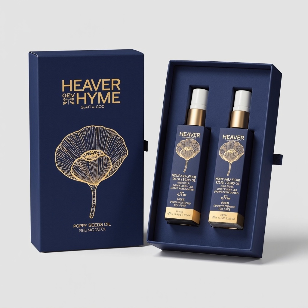 - **产品**:罂粟花籽油 - **品牌名**:花韵 - **包装样式**:天地盖礼盒 - **设计风格**:现代简约奢华 - **设计元素**:罂粟花线条插画、烫金几何纹理 - **主题配色**:深蓝与金