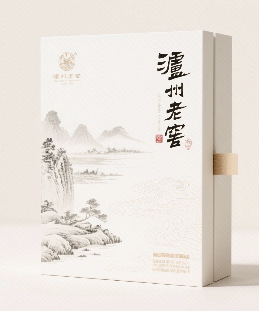 **产品**:白酒 **品牌名**:泸州老窖 **包装样式**:礼品盒 **设计风格**:中式古典风格 **设计元素**:淡墨工笔山水插画、素色书法字、暗纹水波纹 **主题配色**:白(主色)、米白(辅色)、浅灰(点缀色)
