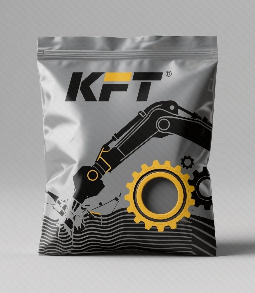 - **产品**:挖掘机破碎锤油封配件 - **品牌名**:KFT - **包装样式**:自封袋 - **设计风格**:硬核工业风 - **设计元素**:破碎锤轮廓剪影、齿轮组线条、液压波纹纹理、粗体品牌字母KFT - **主题配色**:钢铁灰(主)、工程黄(点缀)、哑光黑