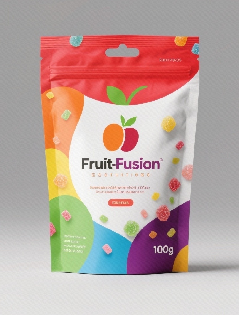 - **产品**:混合口味水果糖100g - **品牌名**:FruitFusion - **包装样式**:自立袋 - **设计风格**:现代简约国际化 - **设计元素**:抽象水果图标、品牌名称文字、口味标签、糖颗粒图案 - **主题配色**:缤纷多色配色:红色、橙色、黄色、绿色、蓝色、紫色