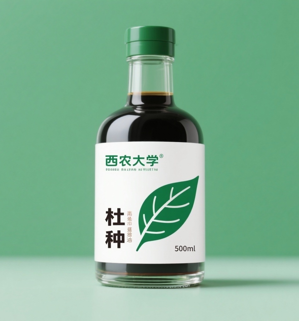 - **产品**:杜仲酱油 - **品牌名**:西农大 - **包装样式**:500毫升玻璃瓶 - **设计风格**:简约现代风 - **设计元素**:杜仲叶轮廓图案 - **主题配色**:绿色、白色