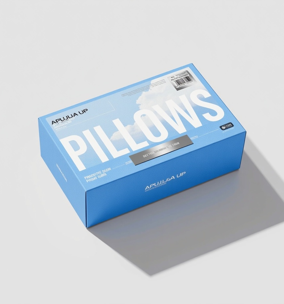 - **产品**:枕头 - **品牌名**:爱普佳UP+ - **包装样式**:礼品盒 - **设计风格**:极简现代 - **设计元素**:渐变蓝背景、品牌名烫银标签、抽象波纹图形、大比例留白区、极简文字排版 - **主题配色**:浅蓝至深蓝渐变