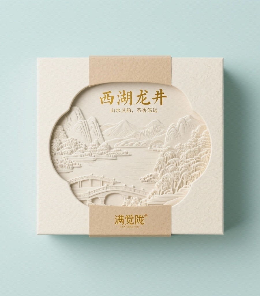 为“满觉陇”品牌的西湖龙井精心设计一款椭圆形且中间带有纸质封套的纸浆模塑包装盒,采用浓郁的中式风格,整体呈现清新、雅致、古朴的美感,将江南水乡的婉约与古典韵味融入其中。设计元素包括:主视觉为椭圆形纸浆模塑上的西湖山水浮雕,清晰而立体;背景为纸浆模塑表面以浮雕工艺呈现的西湖湖光山色、断桥残雪等标志性景观,以及纸质封套淡米色或浅青色素色背景,营造出宁静悠远的氛围;细节融入纸质封套上“西湖龙井”四个鎏金大字、颜体书法的“西湖龙井”标题、宋体的宣传文案“山水灵韵,茶香悠远”,增添文化韵味;品牌标识“满觉陇”可巧妙融入整体画面。主题配色以主色淡雅自然色(未明确色号)为核心,体现西湖龙井的清新特质;点缀色鎏金色(#FFD700)增添高贵质感;辅助色淡米色(#F5F5DC)或浅青色(未明确色号)用于封套背景,柔和整体视觉。包装主体采用纸浆模塑材质,封套为纸质,运用浮雕和鎏金工艺。要求专业摄影、8K超高清、极致细节、 studio lighting(影室灯光)、商业成品、忠实呈现材质与工艺。