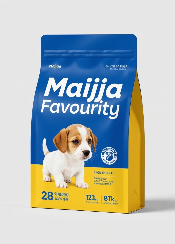 - **产品**:狗粮 - **品牌名**:麦佳恩宠 - **包装样式**:包装袋 - **设计风格**:扁平风、极简主义风 - **设计元素**:真实小狗头像(写实照片风格,无装饰性边框) - **主题配色**:蓝色、亮黄色、白色