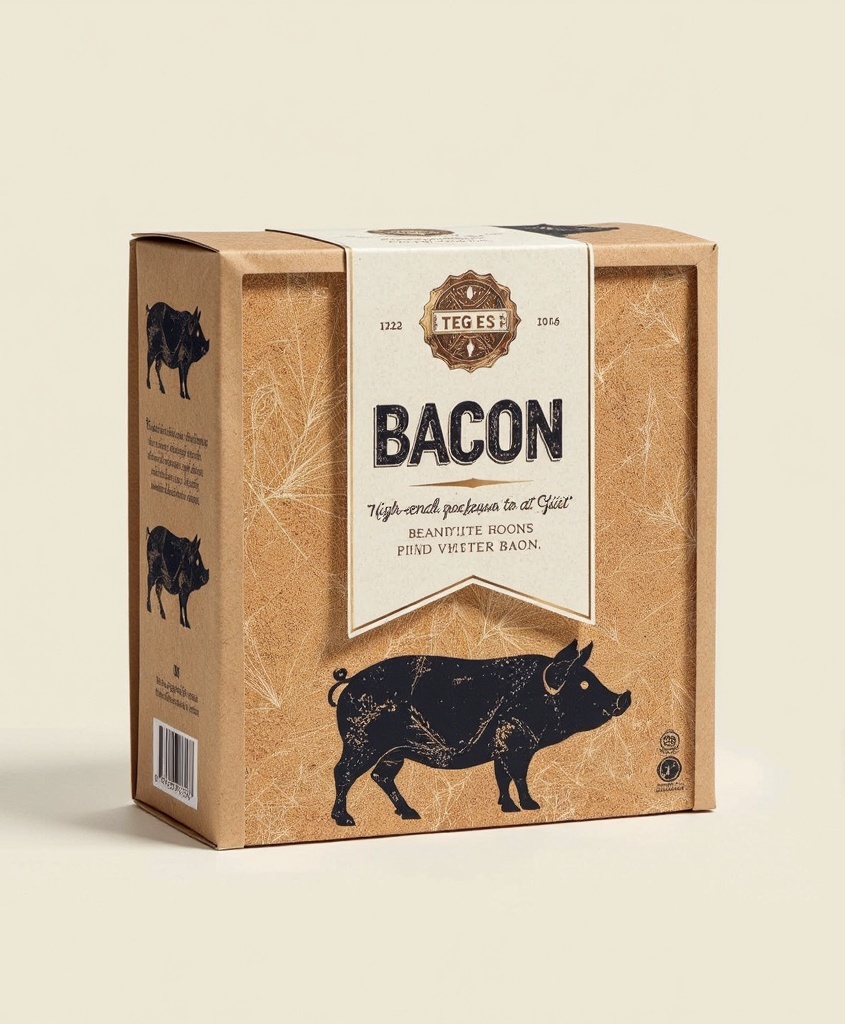 - **产品**: 腊肉 - **品牌名**: 土猪风味 - **包装样式**: 礼品盒 - **设计风格**: 乡村复古 - **设计元素**: 草席纹背景,土猪剪影,主标题“腊肉” - **主题配色**: 米色,棕色,黑色