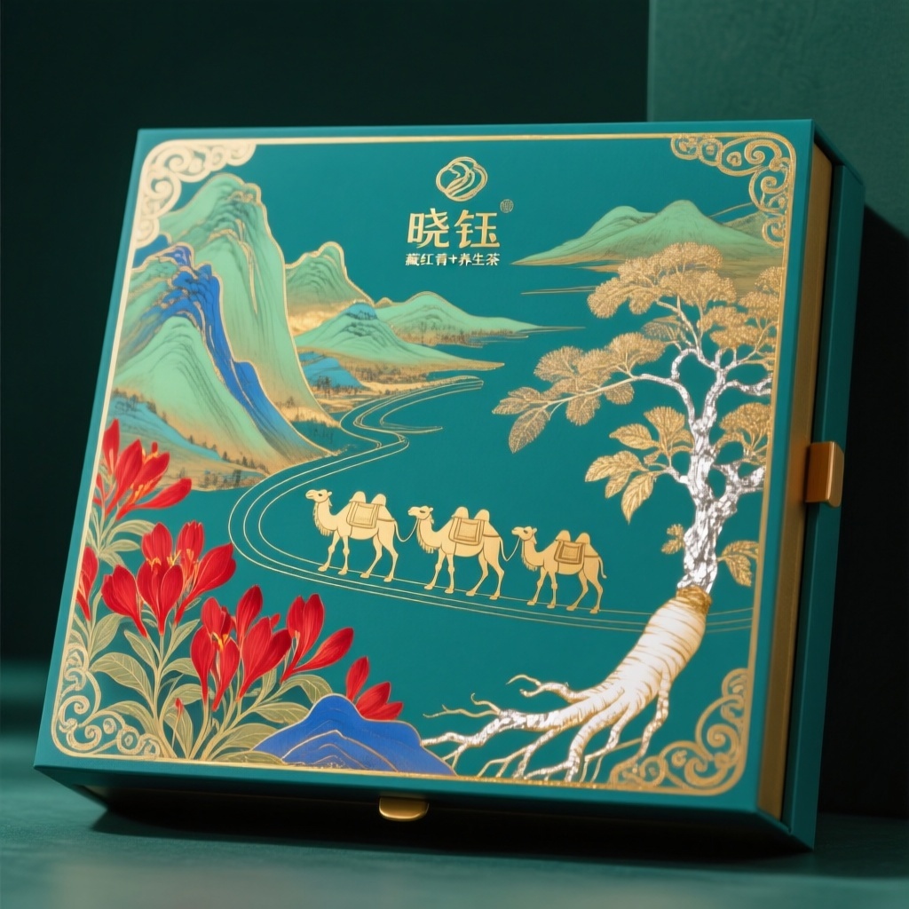 此设计通过唐代青绿山水的开阔格局承载波斯细密画的精密装饰,金碧辉映的视觉效果完美呼应丝路珍宝主题,泥金与胭脂红的强烈对比强化了高端礼品的收藏价值。