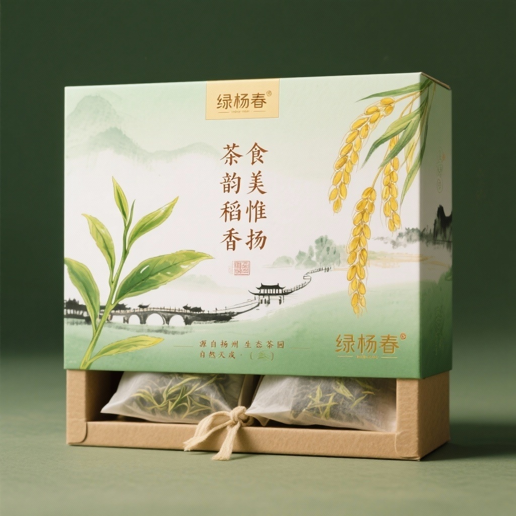 为“绿杨春”品牌的绿杨春茶精心设计一款礼盒包装,采用手绘风格,画面自然且富有文化内涵。设计元素包括:主视觉为左侧舒展的茶树嫩芽和右侧垂坠的金黄稻穗,中间以淡墨笔触晕染扬州瘦西湖或古运河简影;背景结合手绘风格的淡墨笔触,营造自然氛围;细节上,主标题“茶韵稻香 食美惟扬”采用书法字体,“茶韵稻香”偏飘逸灵动,“食美惟扬”偏浑厚稳重,辅助文字如茶叶品类用清晰宋体,下方标注“源自扬州生态茶园”“自然天成”等短句,强化产品品质与地域关联,品牌标识为品牌名“绿杨春”;品牌标识以合适的位置和方式呈现。主题配色以主色茶绿(浅绿到墨绿渐变)为核心,营造茶叶的清新感;辅助色稻黄(暖黄、米白)增添质朴氛围;点缀色赭石色用于文字,凸显文化感。外盒选用环保牛皮纸或竹纤维纸,表面烫金/烫银凸显标题,触摸有自然纹理感,呼应“稻香”的质朴与“茶韵”的雅致,内袋用半透明棉纸,可隐约看到茶叶形态,袋口系米色棉绳,搭配小巧稻穗/茶叶吊牌,提升细节质感。