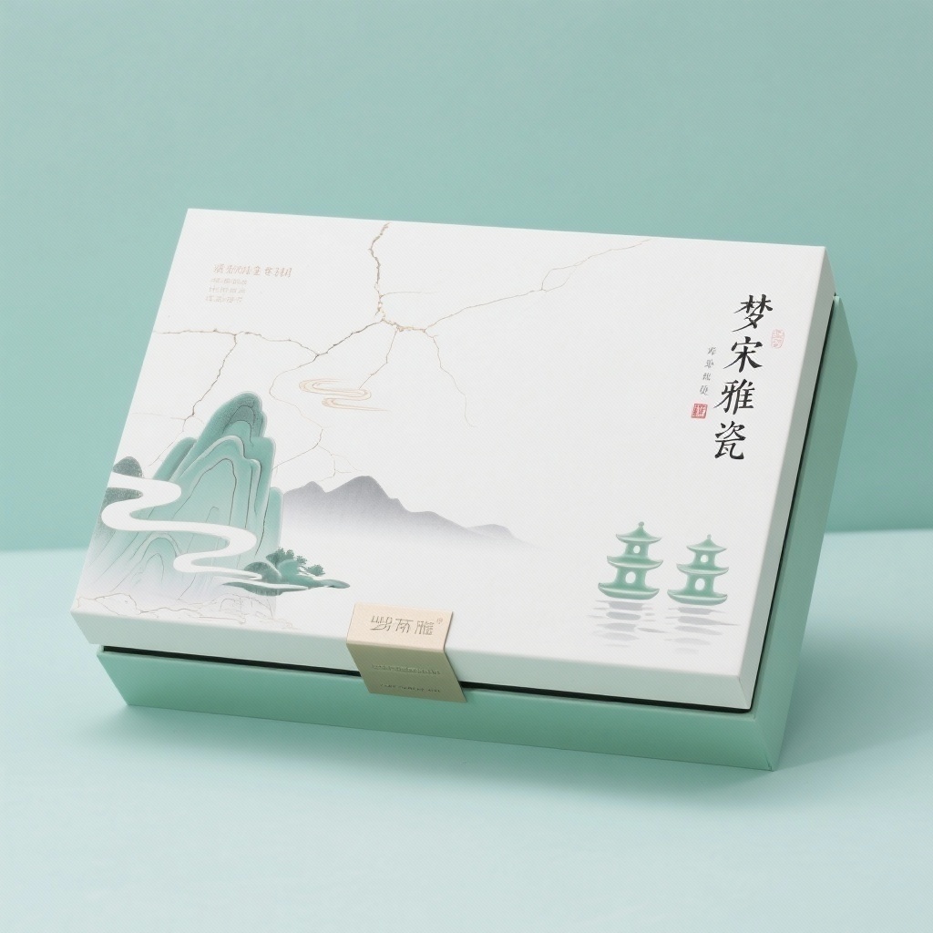 - **产品**:龙泉青瓷茶具礼品 - **品牌名**:梦宋雅瓷 - **包装样式**:礼品盒 - **设计风格**:宋代简约水墨风 - **设计元素**:山水云纹、青瓷裂纹、书法题字、三潭映月图纹 - **主题配色**:青绿色、乳白色、浅灰色