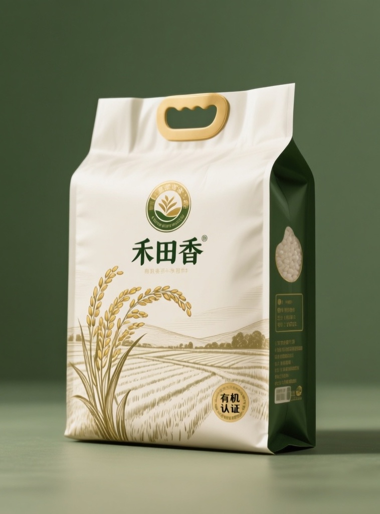 - **产品**:大米 - **品牌名**:禾田香 - **包装样式**:袋子 - **设计风格**:自然简约风 - **设计元素**:稻穗手绘图案、农田背景纹理、品牌logo(圆形徽标)、产品信息文字("有机认证"字样) - **主题配色**:大地绿、米白色、金色