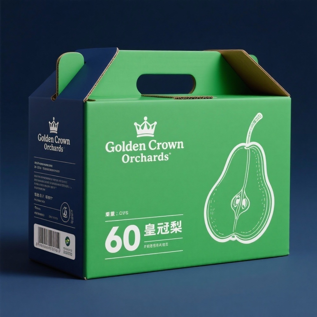 - **产品**:60皇冠梨 - **品牌名**:Golden Crown Orchards - **包装样式**:瓦楞纸箱 - **设计风格**:实用简约风 - **设计元素**:品牌标志、皇冠梨线稿图标、重量规格文字、产地坐标、条形码 - **主题配色**:森林绿、深蓝、白色