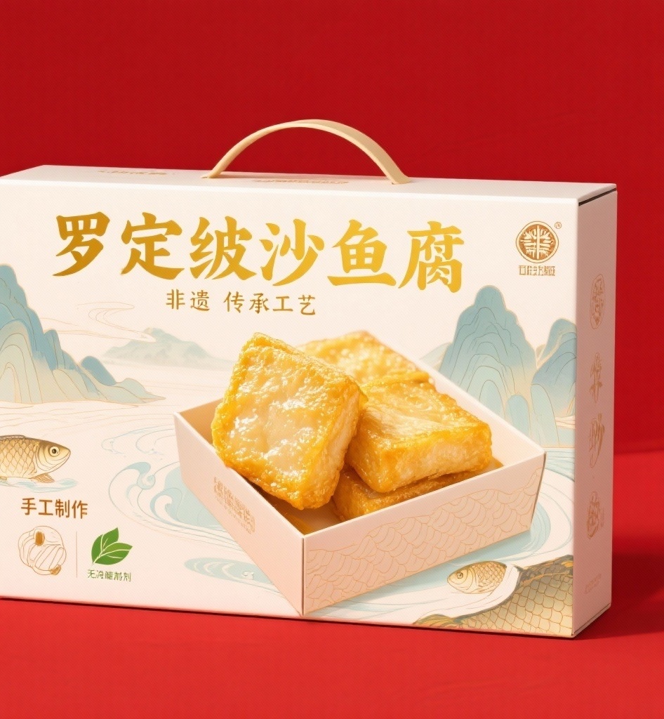 为通用版‘罗定皱纱鱼腐’设计一款冷冻食品包装盒,采用新中式插画风格,主视觉中央为高清实物摄影图——金黄透亮、纹理如皱纱的鱼腐特写,置于画面核心位置,让人一眼识别产品本体。背景为罗定山水淡彩轮廓,辅以流动水波与鱼鳞暗纹,象征产地与工艺传承。包装顶部醒目大字‘罗定皱纱鱼腐’使用粗楷体+烫金工艺,副标‘非遗传承工艺’小字衬底。左下角配置‘手工制作’手绘图标与‘无防腐剂’绿叶图标,右上角嵌入非遗认证标。主题配色以高饱和中国红(#D32F2F)为主色,抓人眼球且耐看;点缀色选用金箔黄(#FFD700)强化传统质感;辅助色为米白(#F8F4E9)平衡视觉,确保信息清晰。包装结构为加厚瓦楞内衬+哑光防滑覆膜,顶部设提手,适合冷链运输与家庭储藏。整体设计让包装‘会说话’,突出‘一眼认出、一见难忘’的产品识别力。