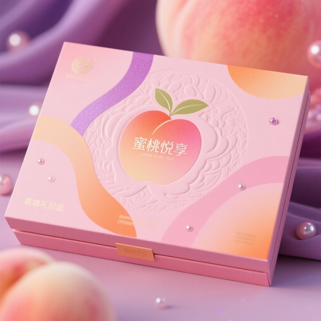 - **产品**:桃子 - **品牌名**:蜜桃悦享 - **包装样式**:礼品盒 - **设计风格**:多巴胺设计风格 - **设计元素**:浮雕质感桃形图案、柔光渐变曲线、珠光粒子 - **主题配色**:蜜桃粉、奶油橙、柔雾紫