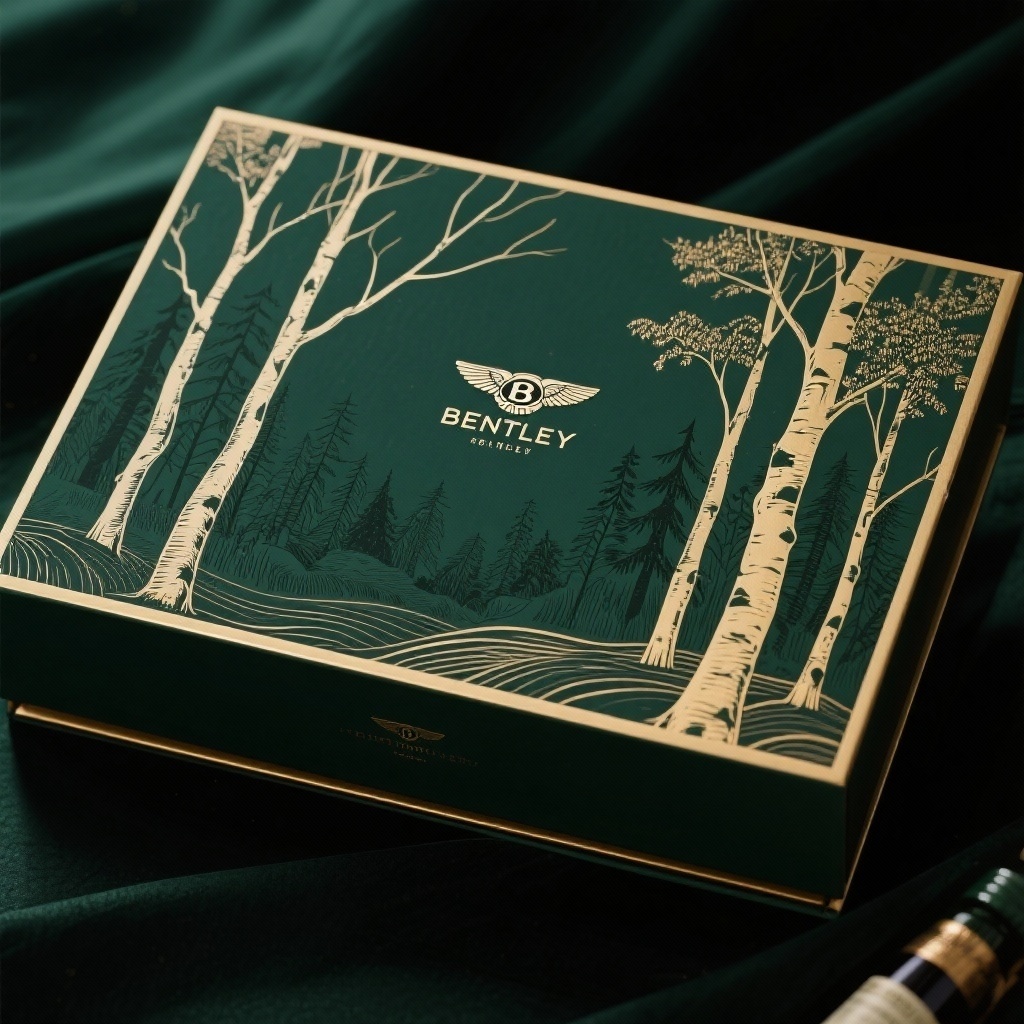 - **产品**:桦树汁 - **品牌名**:宾利 - **包装样式**:礼品盒 - **设计风格**:简约奢华风结合版画元素 - **设计元素**:流畅线条描绘的桦树和森林图案 - **主题配色**:深绿色和金色