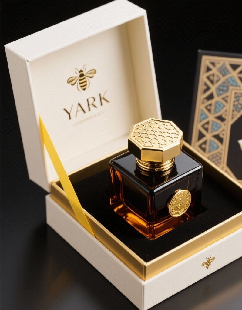 - **产品**:方形香水瓶 - **品牌名**:YARK - **包装样式**:天地盖纸盒 - **设计风格**:融合新疆地域特色的高级简约美学 - **设计元素**:电镀金浮雕瓶盖、蜂巢六边形纹理、艾德莱斯绸几何纹路、抽象蜜蜂与雪莲图标、金色圆形徽章 - **主题配色**:黑琥珀色、米白色、哑金色、淡黄色