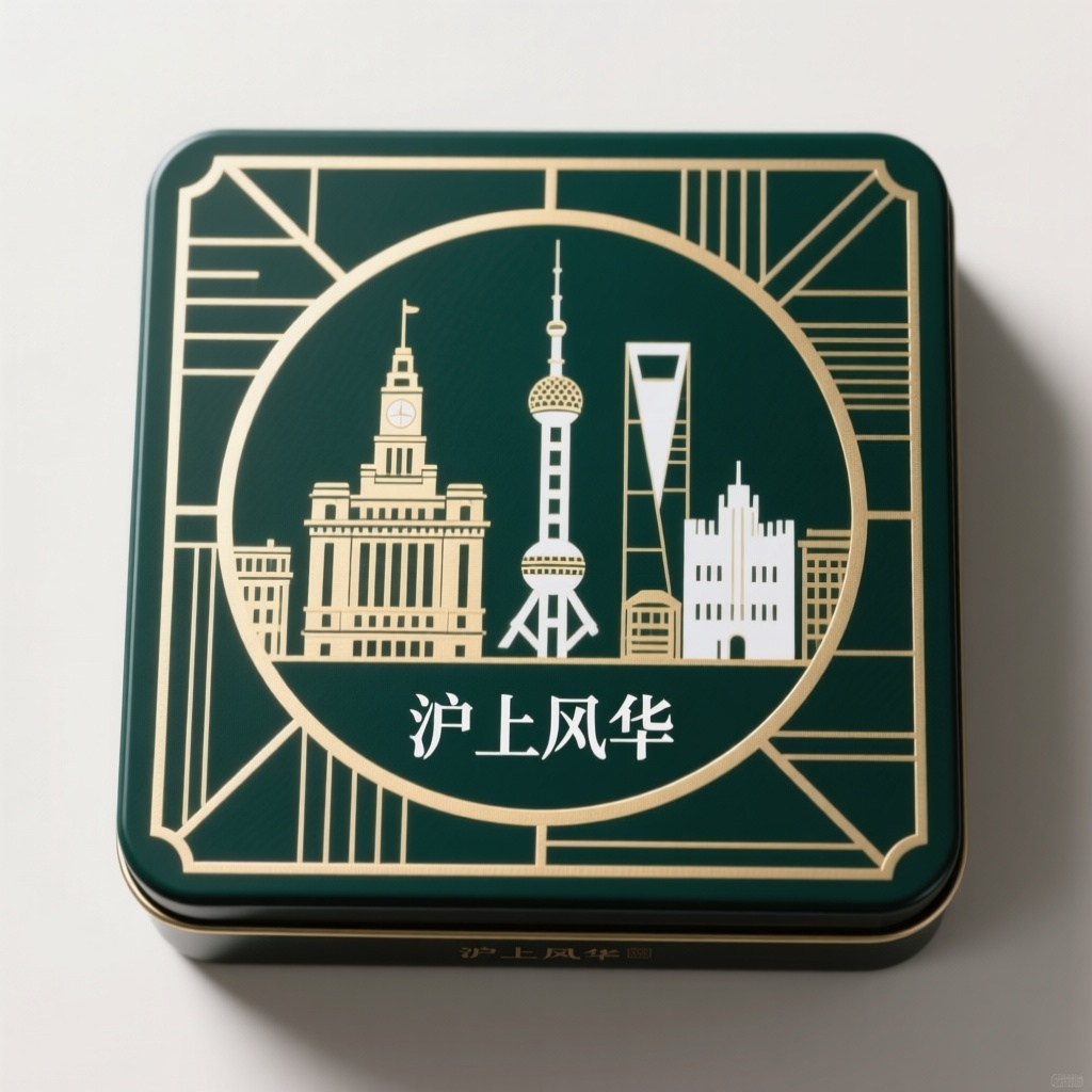 一个高端的方形铁盒包装,用于产品“沪上风华”上海特色食品。采用几何构成风格,将外滩建筑和东方明珠的轮廓解构为简洁的几何线条,并与一个居中的大圆形构图相结合。主色调为深邃的墨绿色哑光材质,建筑线条和圆形边框采用浅金色,形成鲜明对比。品牌名“沪上风华”以现代衬线体、白色置于圆形构图内下方。整体设计充满现代感与结构美,配色方案为海派摩登:主色墨绿,辅色浅金,点缀色白色。包装需体现精致的烫金和高级的磨砂质感。