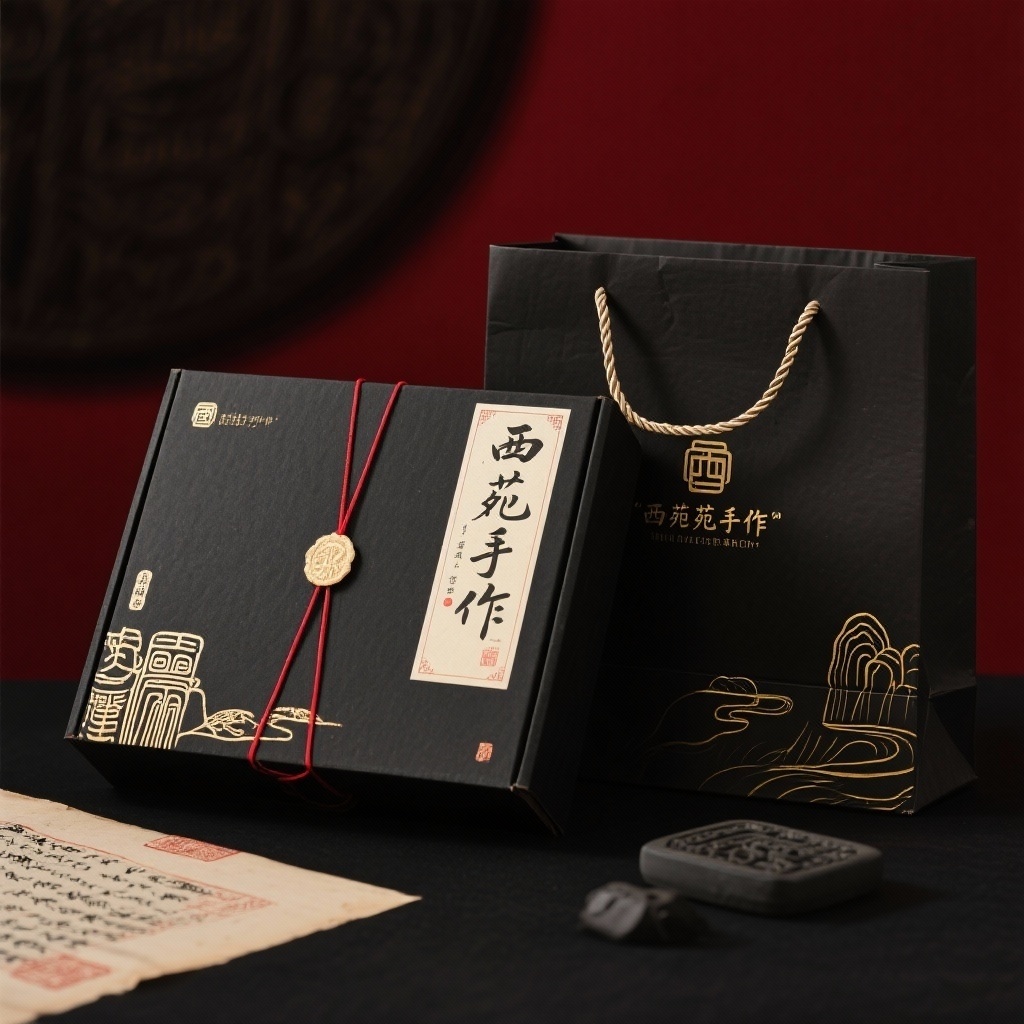 - **产品**:非遗手作——拓石留韵 - **品牌名**:西苑手作 - **包装样式**:飞机盒 + 手提纸袋 - **设计风格**:中国风 - **设计元素**:古代拓片素材、古风封口标签、手写书法标题 - **主题配色**:黑色、金色、红色