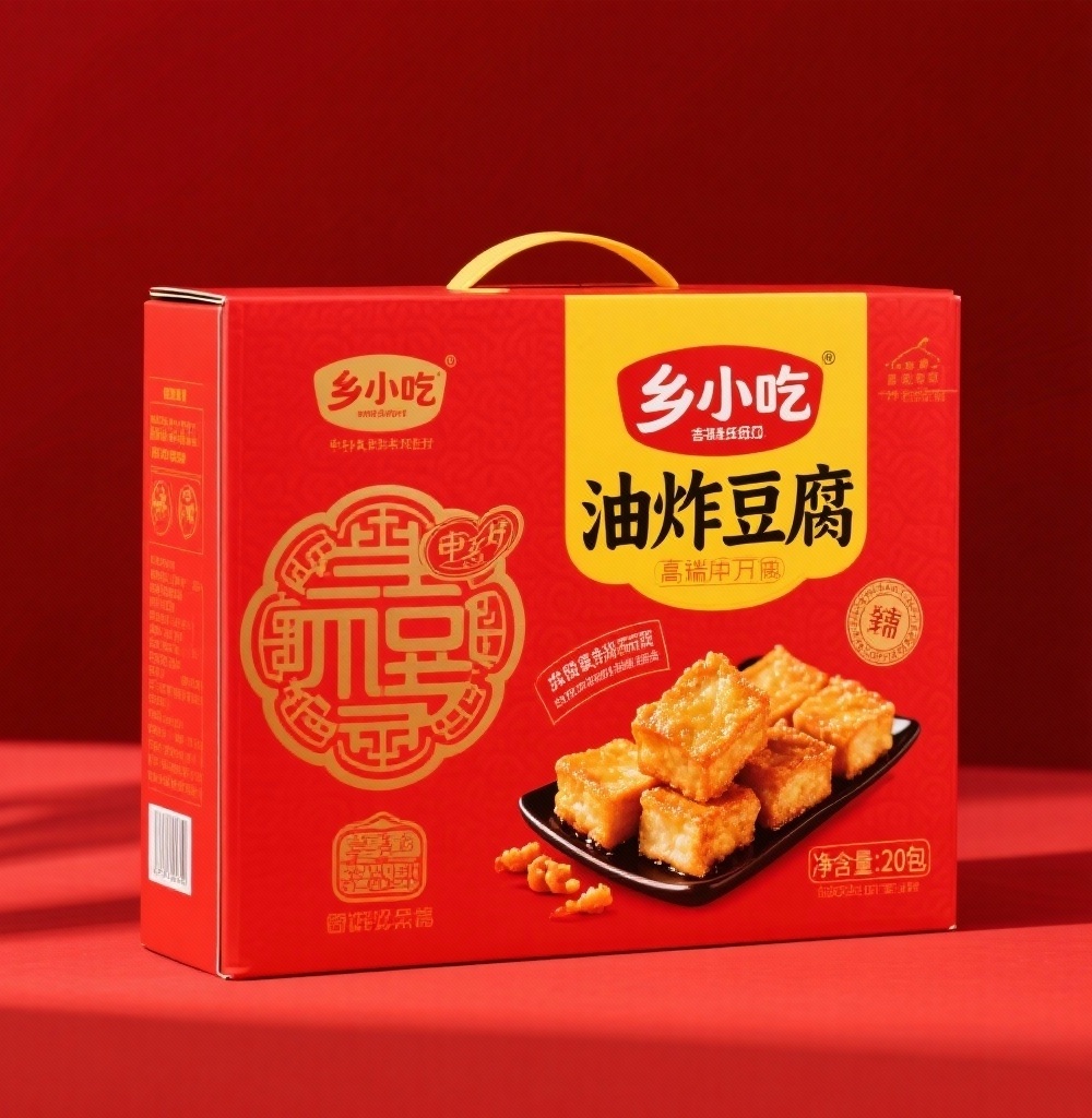 - **产品**:油炸豆腐 - **品牌名**:乡小吃 - **包装样式**:纸盒 - **设计风格**:中式喜庆风 - **设计元素**:食欲刺激油炸豆腐图片、品牌标签、净含量标识(20包) - **主题配色**:红色、黄色、金色