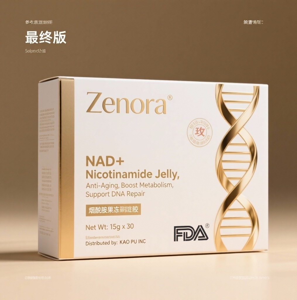 一个高分辨率的NAD+烟酰胺果冻啫喱最终版外包装纸盒设计图,用于展示和交付。设计基于参考图,包含所有元素:品牌名“Zenora”、玫瑰金DNA三螺旋图案、产品信息“NAD+ Nicotinamide Jelly, Anti-Aging, Boost Metabolism, Support DNA Repair”、净含量“Net Wt: 15g x 30”、承销商“Distributed by: KAO PU INC”以及FDA标识。所有元素必须清晰、完整、位置准确,整体风格高端、专业。