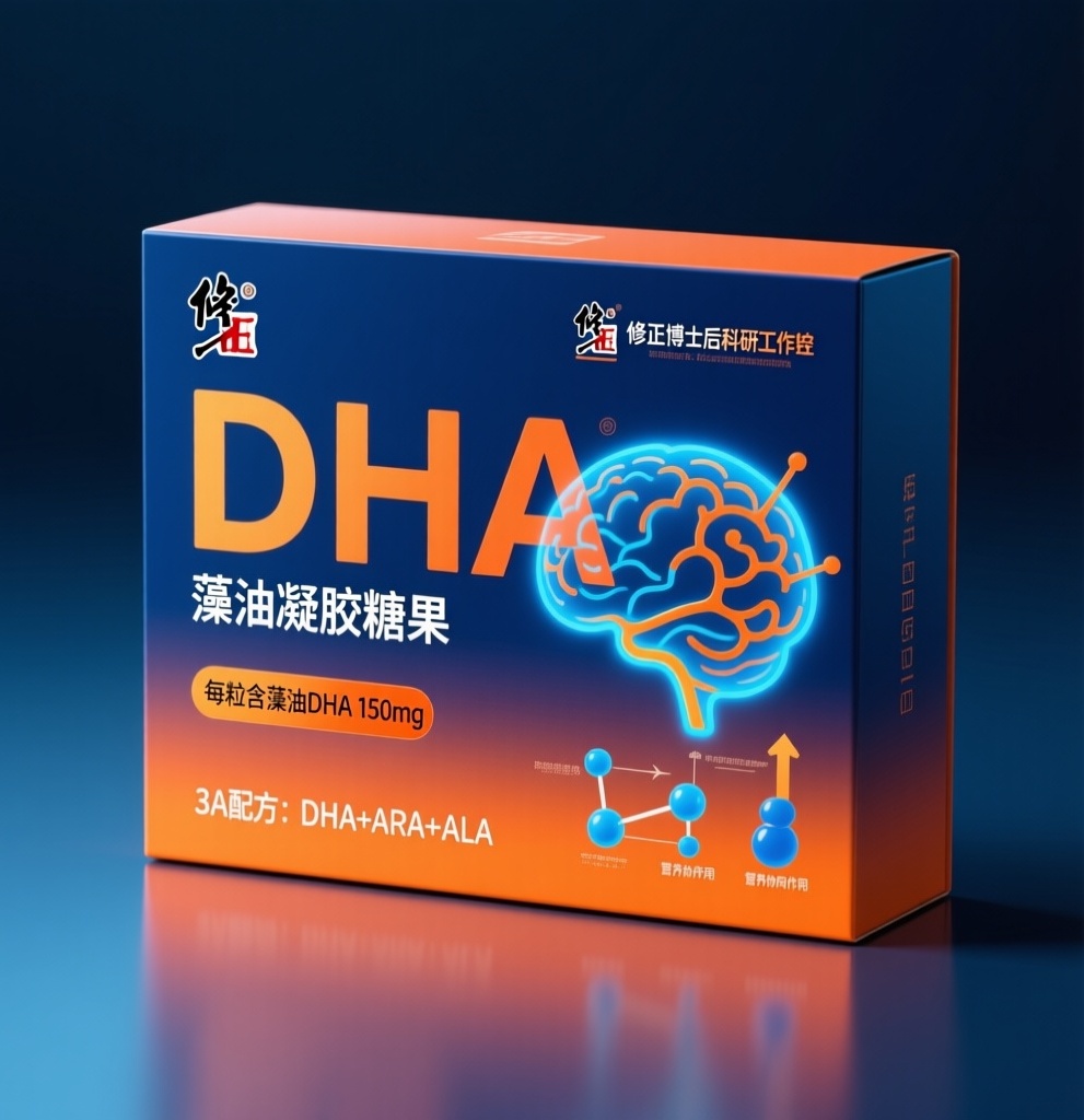 - **产品**:藻油凝胶糖果(无糖型) - **品牌名**:修正 - **包装样式**:长方形纸盒 - **设计风格**:时尚简约潮流风 - **设计元素**: - 超大"DHA"文字主体,弱化"藻油凝胶糖果"品名 - 醒目"修正博士后科研工作站"图标 - "每粒含藻油DHA 150mg"强化标签 - 荧光渐变蓝橙色"大脑神经网络"抽象动态图形 - "3A配方:DHA+ARA+ALA"分子结构示意图(球棍模型+营养协同作用箭头图示) - **主题配色**:深海蓝渐变荧光橙