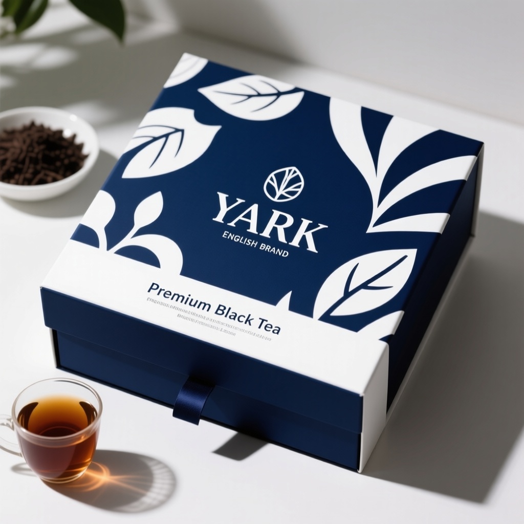 - **产品**: Premium Black Tea - **品牌名**: YARK - **包装样式**: Gift Box - **设计风格**: Modern Minimalist - **设计元素**: English brand logo, abstract leaf patterns, product description in English - **主题配色**: Navy Blue and White