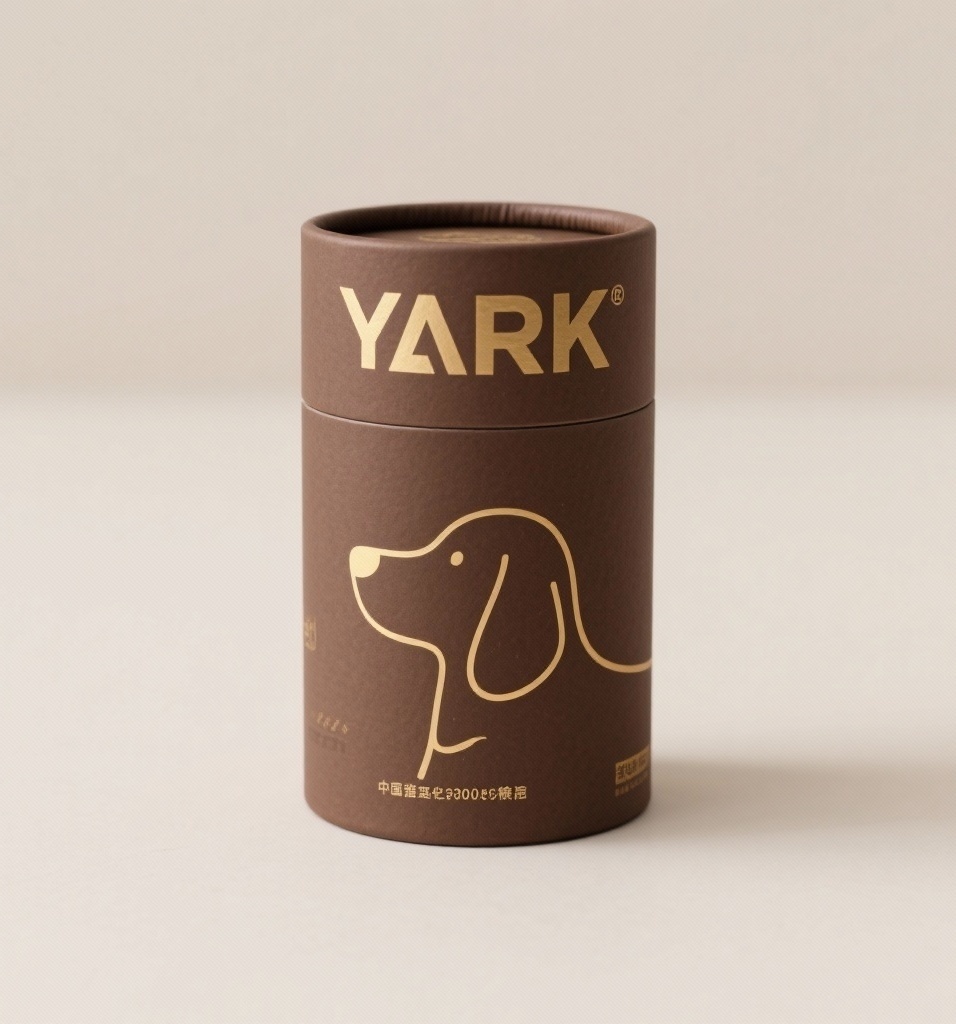 - **产品**:狗粮 - **品牌名**:YARK - **包装样式**:纸壳圆筒 - **设计风格**:极简中国风 - **设计元素**:简笔狗轮廓 - **主题配色**:烫金,咖啡色