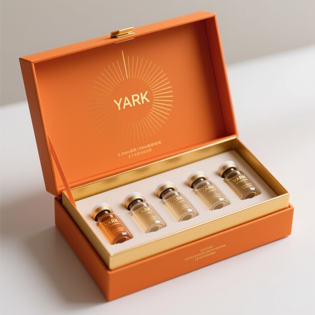 - **产品**:玻尿酸瓶子 - **品牌名**:YARK - **包装样式**:天地盖礼盒 - **设计风格**:极简简约 - **设计元素**:烫金品牌标识、放射性光晕压痕(0.3mm深度|5mm间距同心圆)、EVA吸塑托(精准嵌套5个Φ28mm药瓶) - **主题配色**:爱马仕橙主调 + 金色内衬
