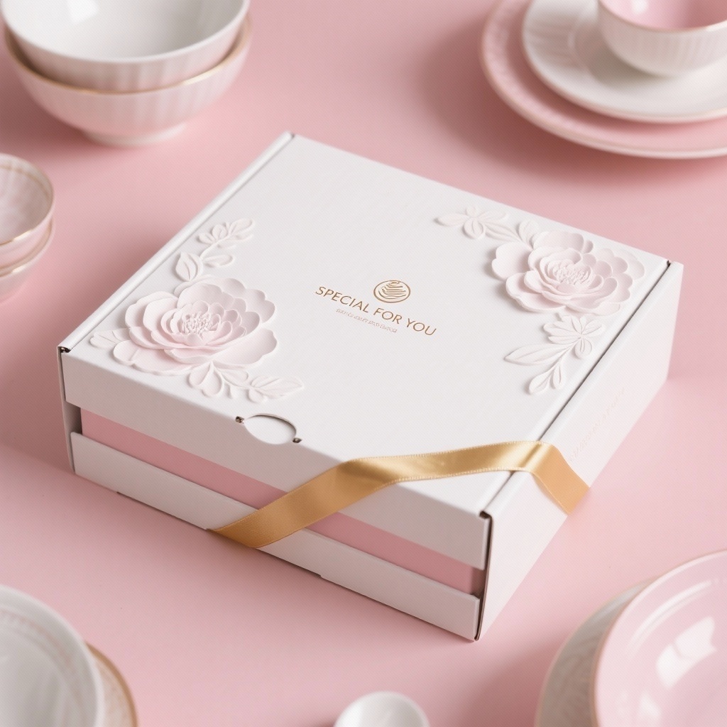 - **产品**:碗具 - **品牌名**:SPECIAL FOR YOU - **包装样式**:飞机盒 - **设计风格**:现代浪漫 - **设计元素**:花朵浮雕、金色丝带 - **主题配色**:白色(底部)、粉色(上方)