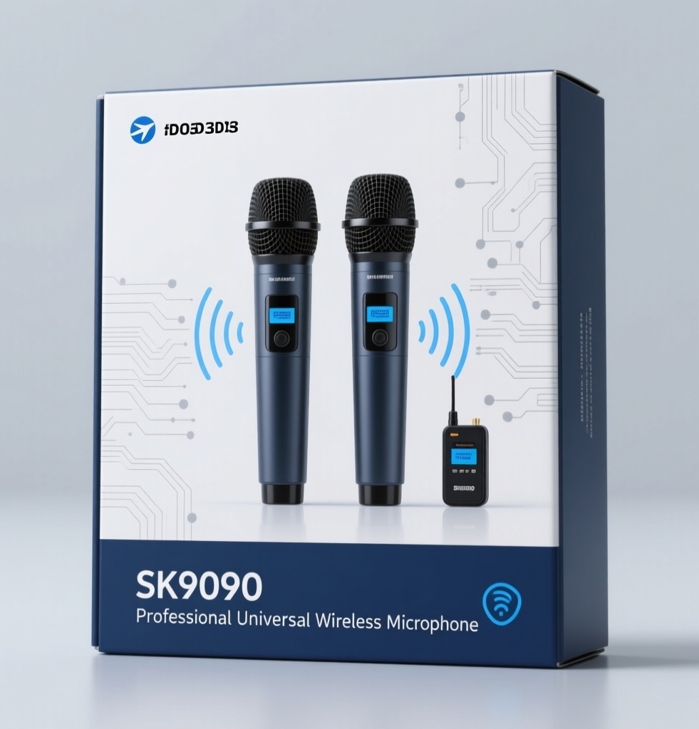 为型号SK9090的无线麦克风设计一款飞机盒包装,整体采用科技简约风格,突出专业感与通用性。设计元素包括:主视觉为两只真实比例的无线麦克风实物图,横向对称排布,并在下方或一侧加入一个小型无线接收器实物图,三者构成协调的设备组合,清晰展现完整无线系统;背景为干净利落的浅灰色(#D3D3D3)底面,营造现代科技氛围;细节处融入微电路纹理或无线信号波形图案,低调呼应无线技术特性;取消品牌标识,仅保留型号“SK9090”和宣传语“Professional Universal Wireless Microphone”,以细体无衬线字体排布于设备图像下方,保持版面简洁有序。主题配色以主色深蓝(#003366)传递专业与信赖感,点缀色亮蓝(#0099CC)用于关键信息或图标强调,辅助色浅灰(#D3D3D3)平衡整体视觉,使包装简洁而不失科技质感。