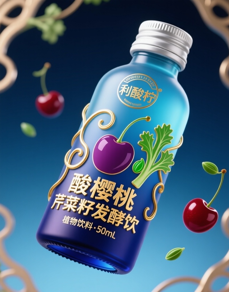 • **悬浮立体金箔字牌**:"酸樱桃芹菜籽发酵饮"(3D凸印透明白底金字)