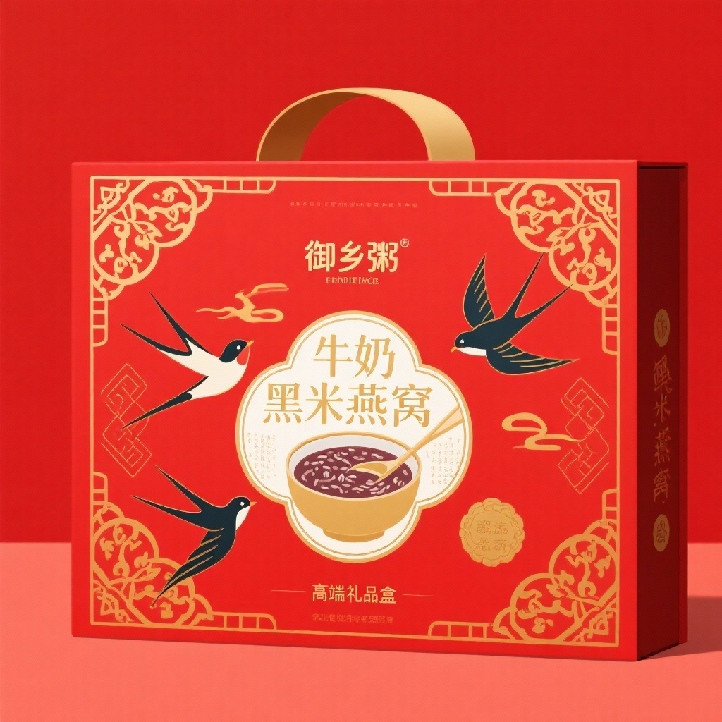 - **产品**:牛奶黑米燕窝粥 - **品牌名**:御乡粥 - **包装样式**:礼品盒 - **设计风格**:扁平矢量 - **设计元素**:传统纹样、燕子图案、金色花纹 - **主题配色**:红色、金色
