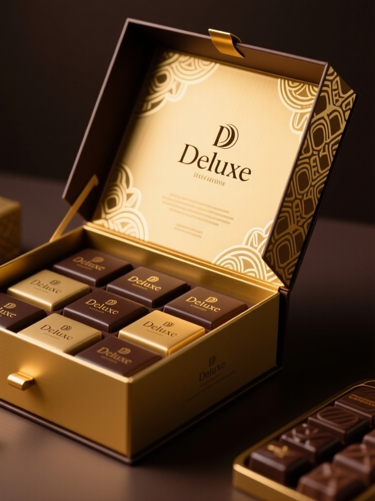 - **产品**:高端巧克力礼盒 - **品牌名**:Deluxe - **包装样式**:礼品盒 - **设计风格**:现代奢华 - **设计元素**:品牌名称和产品信息文本分散融入整体设计中(例如:在盒面、侧面和内部均匀分布,配合图案元素) - **主题配色**:金色和深棕色